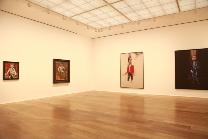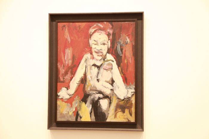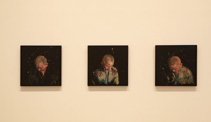其中的一個展廳區域有着三幅很特殊的畫,是曾梵志的自畫像,吸引了很多人駐足欣賞。