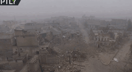 ▲戰後一片廢墟的敍利亞重鎮阿勒頗