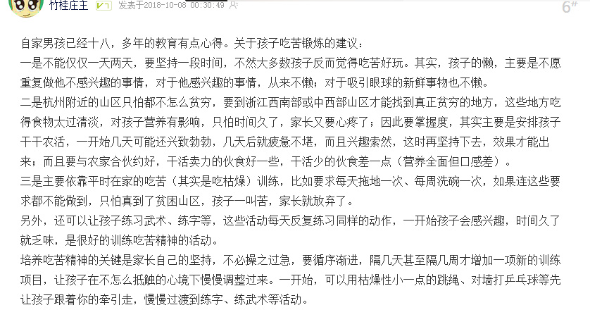 網友“竹桂莊主”跟帖説,自家男孩已經十八,關於孩子吃苦鍛鍊,有一番心得——