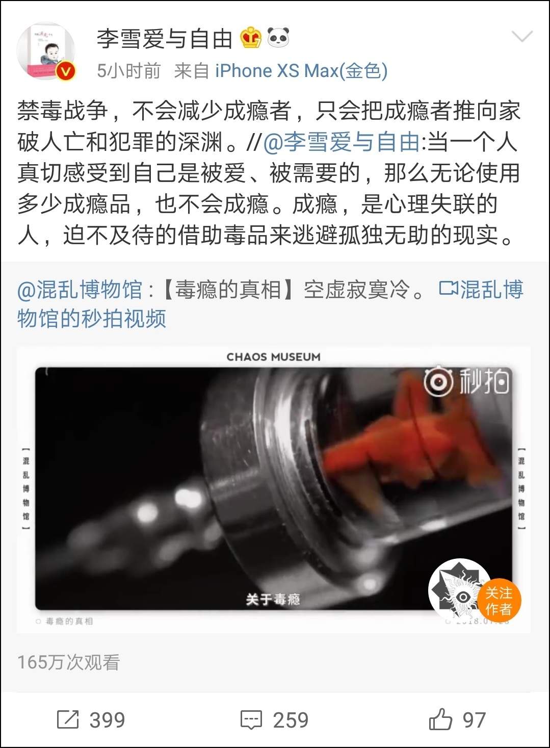 查詢了一下李雪的個人微博,發現她提起反對禁毒的議題已經有相當長的時間了。