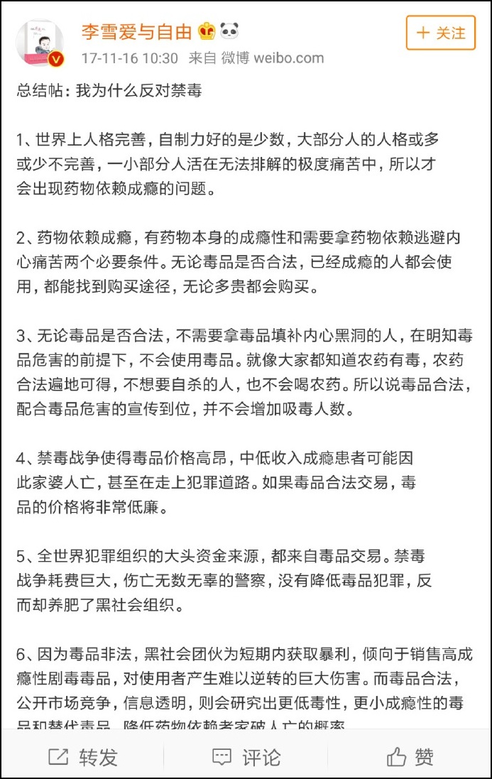 再濃縮一下,李雪是從吸毒原因、放開管控會使得毒品價格下降、毒品合法不會增加吸毒人數、禁毒戰爭耗費巨大等幾個角度闡述自己反對禁毒的立場。