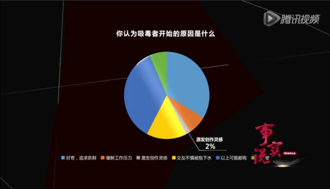 但是節目組在騰訊新聞客户端上進行的一份近200萬人參與的問卷調查卻顯示,“好奇、追求新鮮”、“交友不慎被拖下水”,以及多種複雜因素結合才是導致吸毒者開始的原因,“激發創作靈感”和“緩解工作壓力”只是少數。