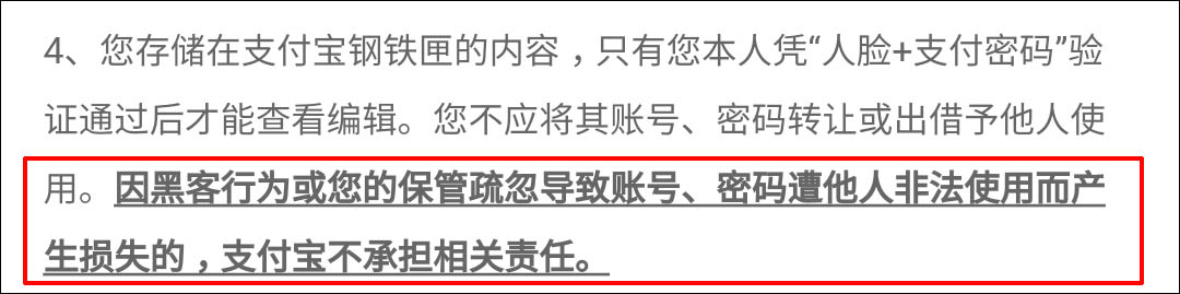 另外,在協議中,支付寶對鋼鐵匣應用對於服務的安全性似乎有點搖擺不定。