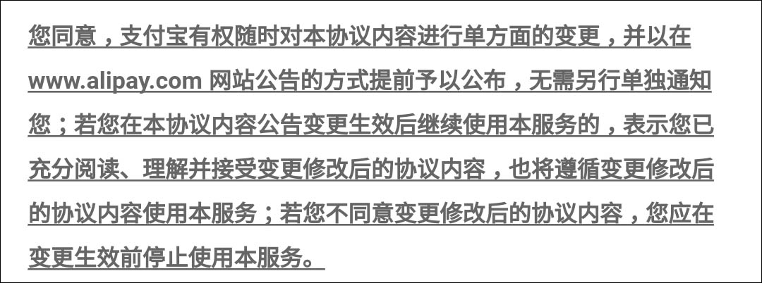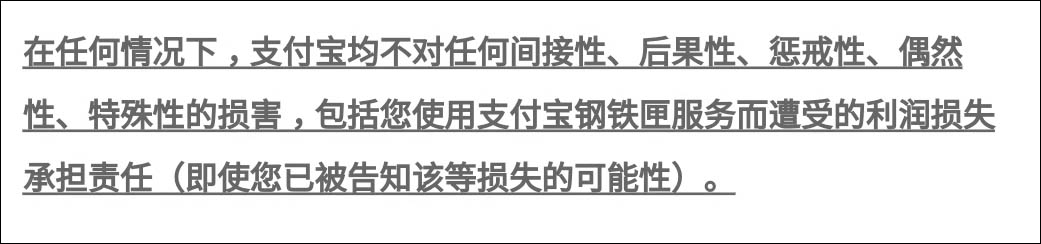 通過閲讀協議內容第二段,可以看出來支付寶是知道這個協議存在一些“可能會引起用户誤會”的內容,所以特別強調了您需要閲讀協議全部內容,特別是粗體下劃線的內容。