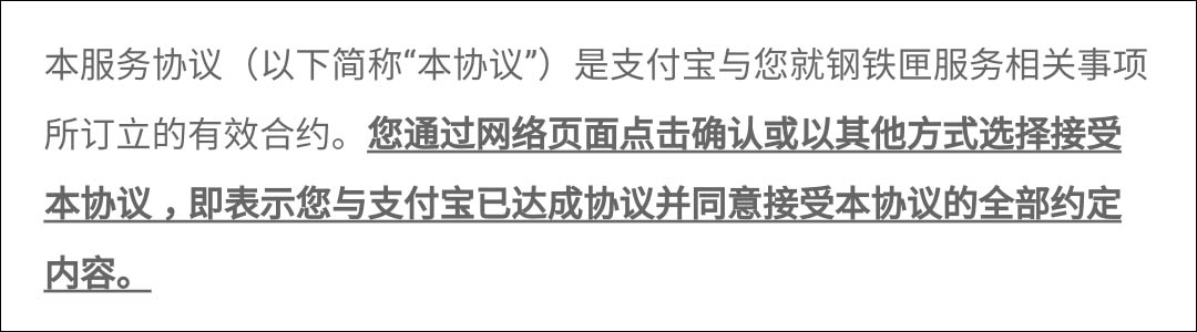 《支付寶鋼鐵匣協議》本質上屬於合同,既然是合同就應該嚴格遵守合同法的規定。《支付寶鋼鐵匣協議》這種當事人為了重複使用而預先擬定,並在訂立合同時未與對方協商的合同屬於格式條款合同。根據法律規定,支付寶使用格式條款應該採取合理的方式提請用户注意,簡言之就是格式條款合同要放在顯著位置,讓用户一目瞭然。