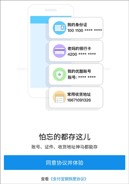 支付寶也介紹了鋼鐵匣的使用場景,包括幫助用户記錄銀行卡、各種網絡平台賬號密碼、證件號碼等。