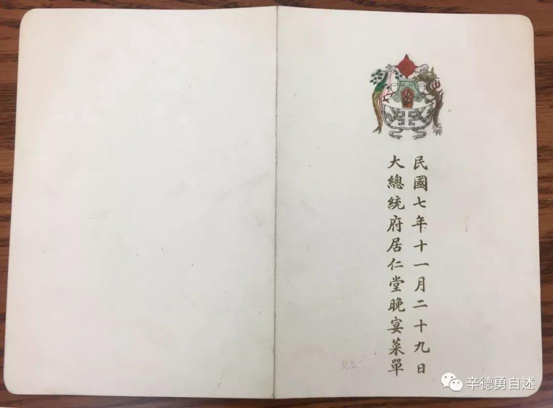 這份菜單外邊的正面,印着北洋政府由魯迅等人設計的十二章國徽(又稱嘉禾國徽),國徽下面,雙行豎排印有“民國七年十一月二十九日/大總統府居仁堂晚宴菜單”字樣。