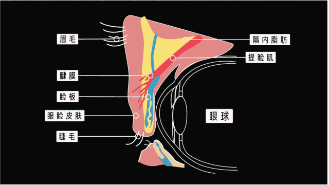 這是雙眼皮和單眼皮的上眼瞼側面解剖圖,從外到內分佈着十幾層組織,其中,瞼板類似軟骨,負責支撐眼瞼,而提瞼肌及其腱膜則會在收縮時牽動眼瞼向上運動,讓人睜眼。