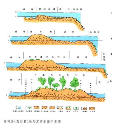 另外“島”的形成除了火山爆發、版塊運動一類的地質活動以外,就是靠小珊瑚蟲們一點點蓋了。一般先蓋成幾個小山、或圈子(就是礁石了),然後海浪不斷的把沙子衝上去,慢慢形成陸地(沙洲),然後再長樹形成陸地生態環境,就成了能住人的“島了”。
