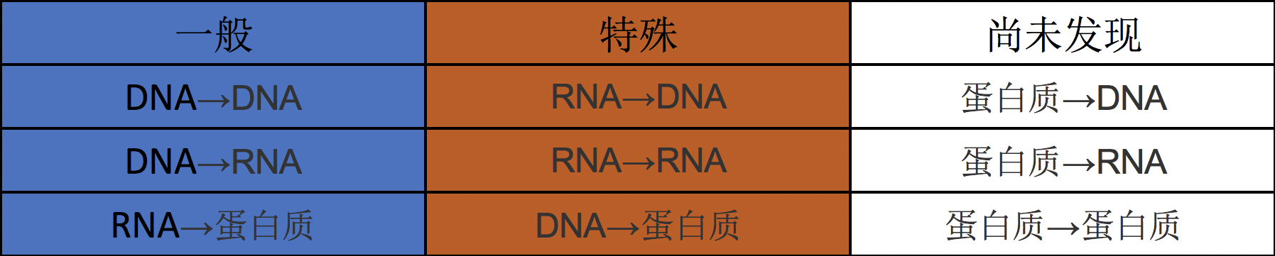 中心法則顧名思義,是現代生物學最重要最核心的部分,無論什麼樣的生物學研究,都離不開對它的應用。那麼,什麼是中心法則呢?簡而言之,**中心法則就是遺傳信息在三種生物大分子之間週轉的形式。**哪三種生物大分子?脱氧核糖核酸DNA, 核糖核酸RNA, 蛋白質protein。這三種大分子都能承載一定的遺傳信息。按照這些週轉形式在自然界中的常見程度,我們可以得到以下的一張表格【1】