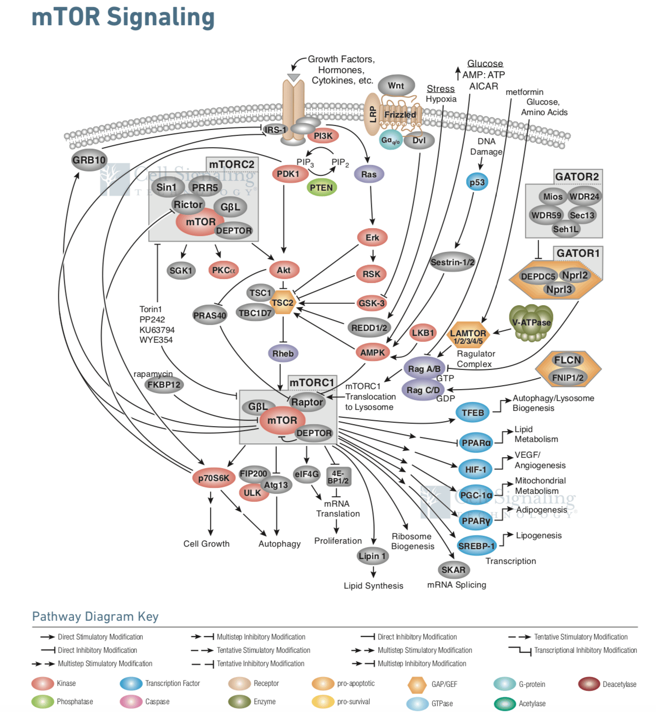 以mTOR基因為中心的細胞信號通路圖示。mTOR是一種主要的生長調節分子,可感受並結合不同的營養因素和環境因素,包括生長因子、能量水平、細胞應激,以及氨基酸【12】