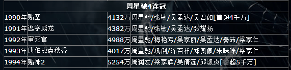 不同於80年代末期成龍和周潤發的強烈競爭,周星馳不僅將這4年的票房冠軍統統收下,他主演的其它電影也大多進入年度票房榜前十。