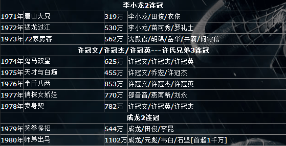 香港電影早期歷史沒啥亮點,要從1971年李小龍橫空出世,才算有點看頭。李小龍去世以後,許氏兄弟的市井喜劇流行開來,1974年到1978年,許冠文實現了票房冠軍三連冠,並5年4冠。許冠傑是個天才,1973年才開始拍電影,第二年就拿下票房冠軍,並基本壟斷了1974-1984這10年間的票房冠軍。
