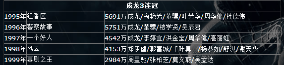 周星馳實現票房爆發以後,又輪到成龍發威,1995-1997年成龍拿下了年度票房冠軍三連冠。