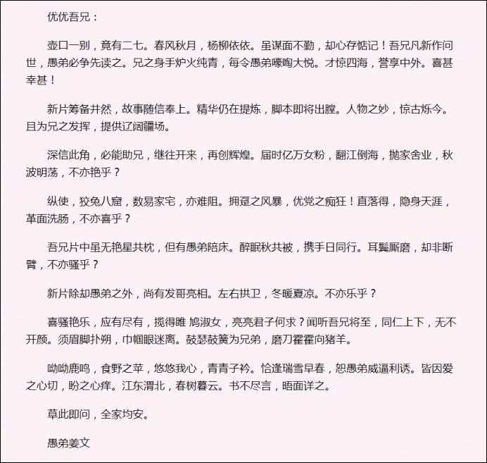 新浪娛樂訊 早些年,姜文在拍《讓子彈飛》時寫給周潤發、葛優的信最近又被翻出來了。姜文當時寫了兩封字短情長的信給二位影帝,邀請他們出演影片,言辭懇切、文藻優美,還差點讓兩位收信人產生誤解。