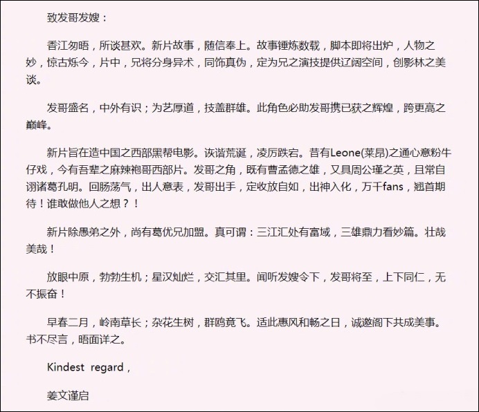 新片籌備井然,故事隨信奉上。精華仍在提煉,腳本即將出膛。人物之妙,驚古爍今。且為兄之發揮,提供遼闊疆場。