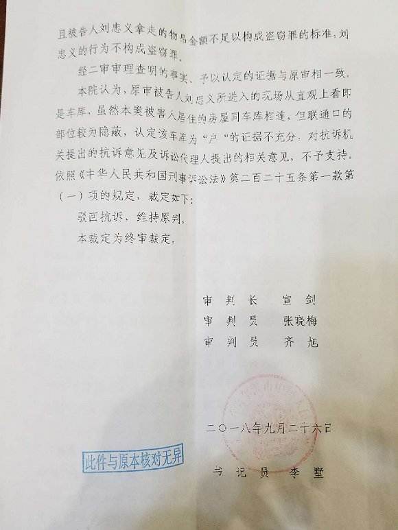 二審判決書顯示,哈爾濱中級人民法院認為,經二審審理查明的事實,予以認定的證據與原審相一致。劉忠義所進入的現場從直觀上看即是車庫,雖然趙某居住的房屋同車庫相連,但聯通口的部位較為隱蔽,認定該車庫為“户”的證據不充分,對抗訴機關提出的抗訴意見及訴訟代理人提出的相關意見,不予支持。所以駁回抗訴,維持原判。