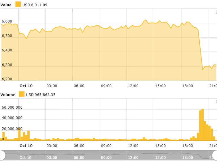 在10月8日飆升至6600美元以上之後,今天比特幣跌至6300美元以下。主要的加密貨幣交易所已經降至6284美元,然後在發稿時略微恢復到6315美元。比特幣在24小時內下跌4.65%,過去7天下跌3.36%。根據金牛財經APP比特幣價格指數,比特幣幾乎沒有保持每月漲幅。
