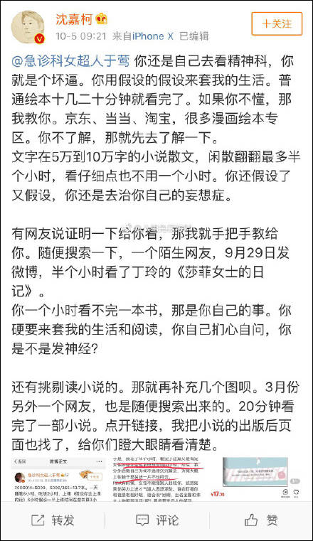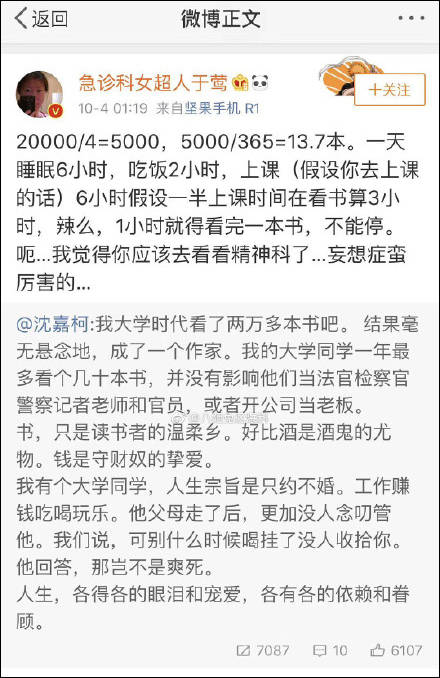 此人隨後遭到沈嘉柯發文反駁,他指出,這兩萬多本書裏,包括了漫畫繪本、5萬到10萬字的小説散文,這些書讀完還不到一小時。一天看十幾本書,有什麼奇怪的?