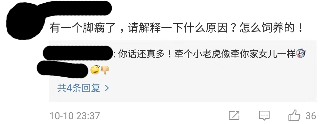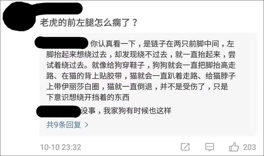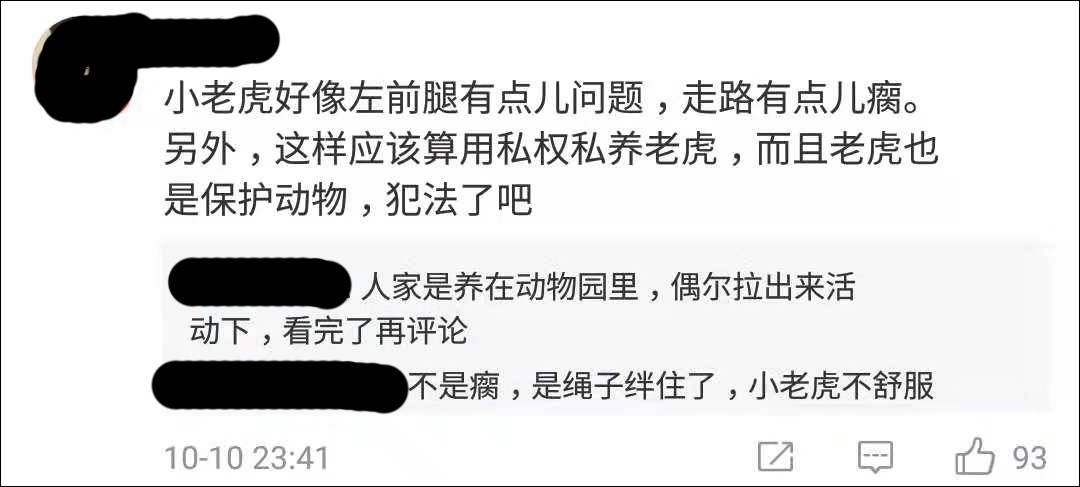 有網友質疑,小老虎的腿怎麼一瘸一瘸的。在這層評論中有網友解釋道,是因為老虎被繩子絆到了。