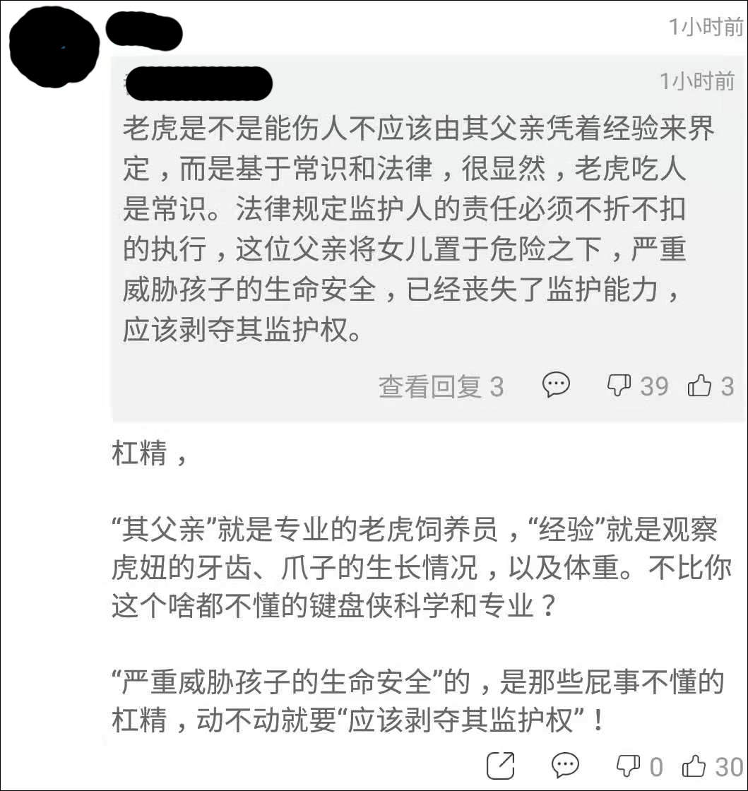 當然啦,觀網有很多正經評論的,比如下面這個。有觀網網友手,老虎是否傷人應該根據常識而不能根據父親的經驗。父親將女兒置於危險之下,應該剝奪其監護權。隨後有網友反駁説,這種説法過於槓精。
