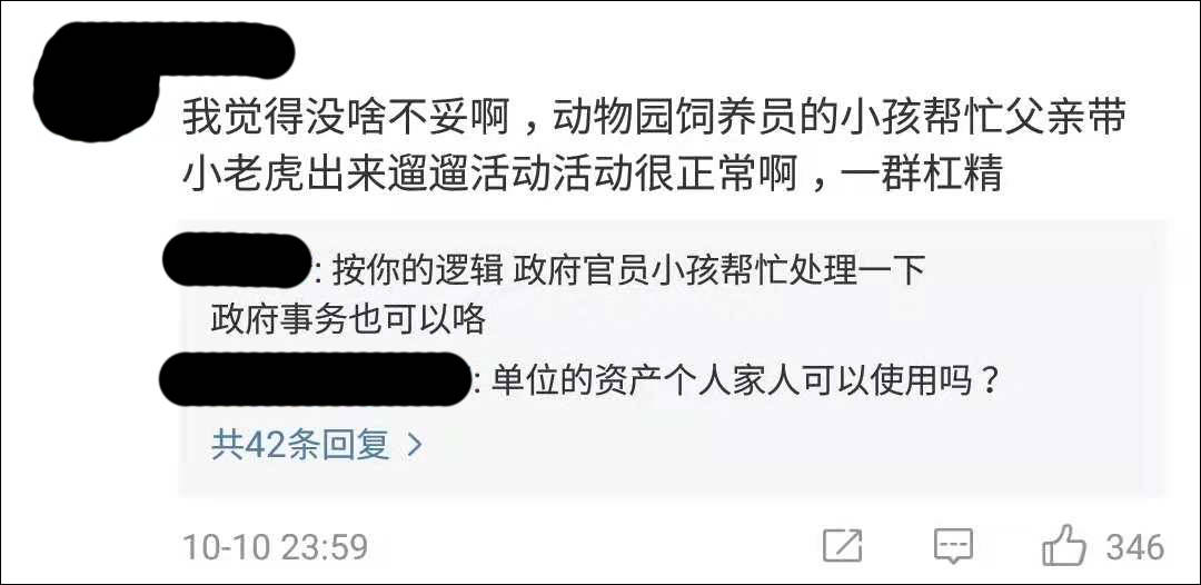 有網友覺得,動物園飼養員的小孩幫父母照顧一下小老虎很正常,但卻遭到了網友的反駁。