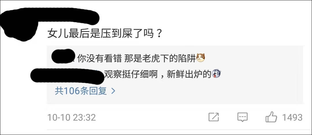 關於視頻的重點,有的網友的視角總是那麼的清新脱俗。這位網友説,小女孩最後是壓到老虎的屎上面了嗎?