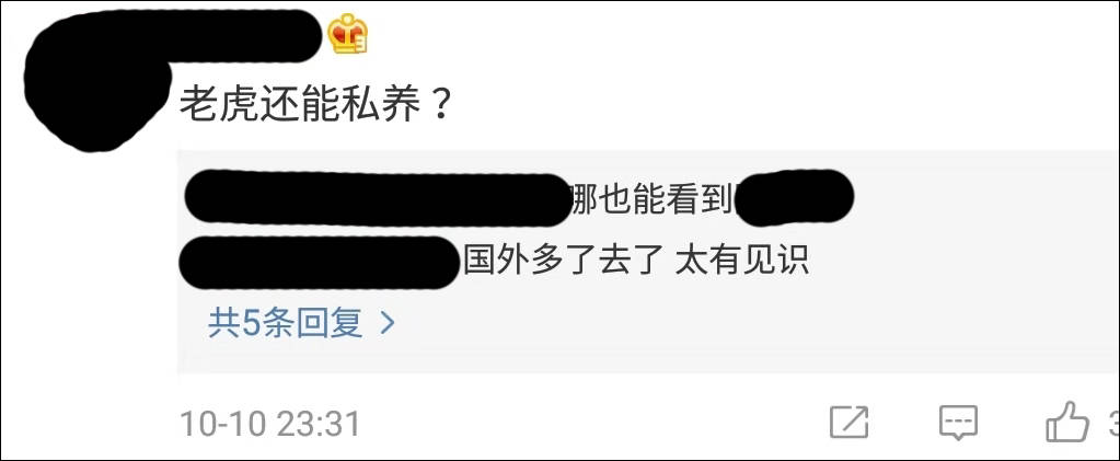 這條微博的評論區比較熱鬧,好像很多人沒看視頻就跑道評論區來了,説私養老虎是犯法的。