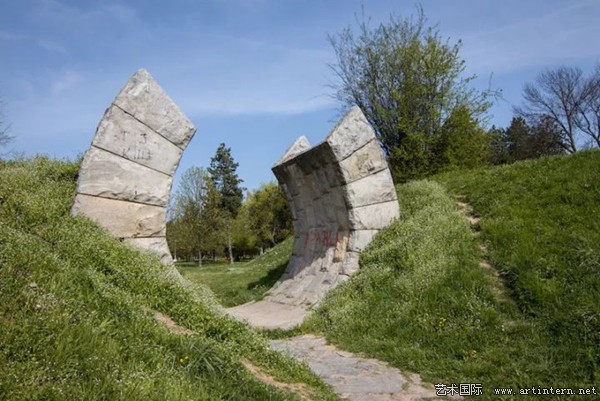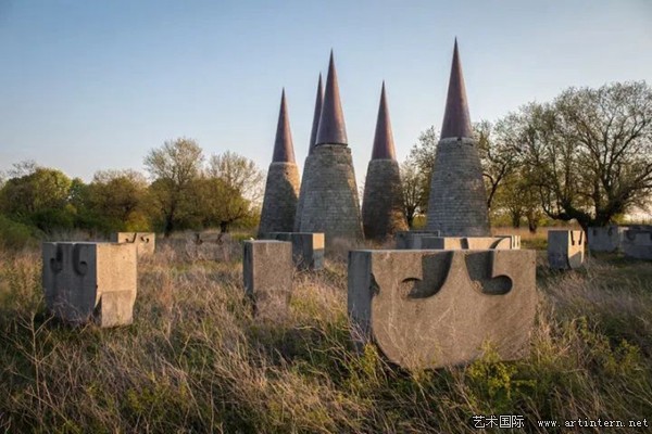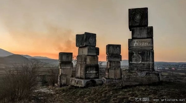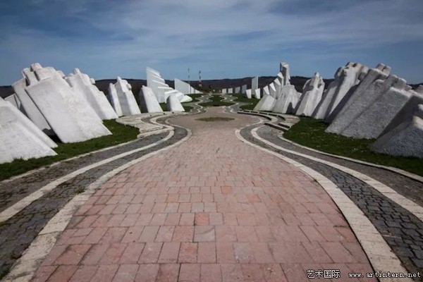 波黑Garavice紀念碑。這座紀念碑是為了悼念1941年7月被殺害於此的12000名塞爾維亞和猶太平民。13個相同的石柱象徵着傳説的亞特蘭蒂斯,堆疊的石塊象徵着迷霧中永恆的悲傷記憶,同時,扭曲的道路指向米諾斯迷宮,意味着從絕望中獲得勝利的希望。圖源:Spomenik Database