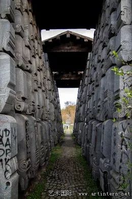 塞爾維亞Čačak紀念碑。紀念碑由3個12米高的石木材質的尖頂建築組成,內壁雕刻着620個神獸的獸頭。圖源:Roaming Canuck
