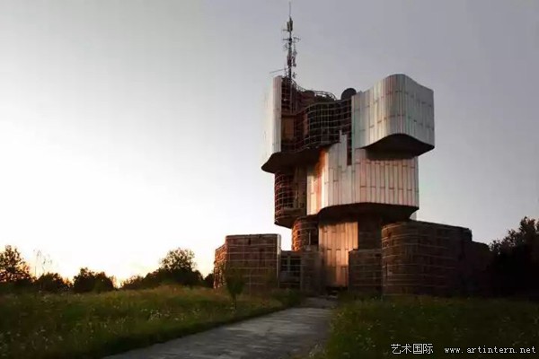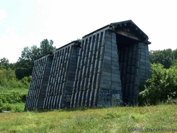 克羅地亞的柯爾敦與班吉亞人民起義紀念碑。為紀念二戰期間因烏斯塔沙(Ustaša)政權襲擊而喪生的300餘名塞爾維亞平民而建。碑體建築由鋼筋混凝土製成,並覆蓋着不鏽鋼板。其內部樓梯迴廊曲線豐富,很有識別性。當年用作博物陳設以及進行愛國主義教育。1991年後,南斯拉夫內戰期間,此紀念碑遭到嚴重破壞,大量不鏽鋼板被當地人盜取。圖源:公共領域