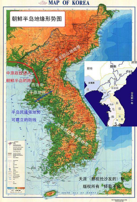 中國曾經在短期內前突進了朝鮮半島北部,這很正常,但地緣結構造成這種佔領不可能成為長期行為(原因我前面已經分析過了,事實上漢族勢力只能沿着朝鮮半島的西海岸地勢較平緩的地區前進一點,並非能佔領全部的北朝鮮地區。)。