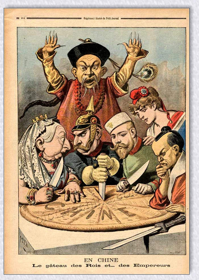 1898年法國《Le Petit Journal》刊登的圖片展示了各國列強圍坐在餐桌前,分割“中國”大餅,而清朝官員只能乾着急。漫畫從左到右為英國女王維多利亞、德國皇帝威廉二世、俄國沙皇尼古拉二世、代表法國的瑪莉安女士及日本武士。CHINE是法語中國的意思。