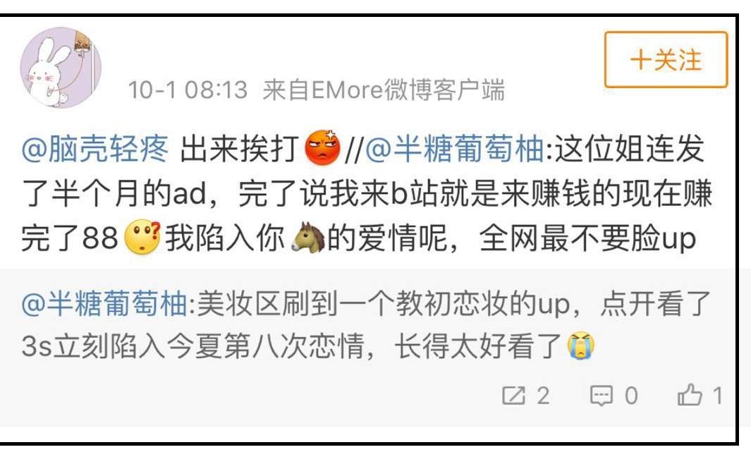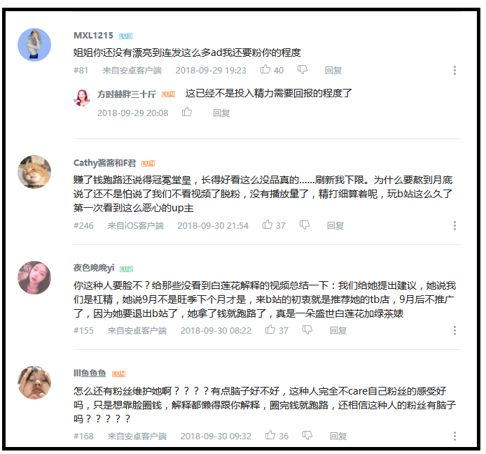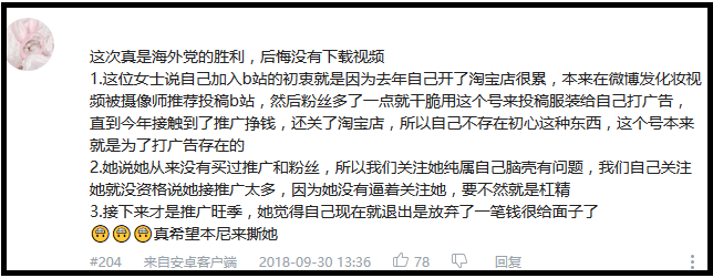 來,跟大家算一筆賬啊。B站的推廣,大概是5000左右,這位小姐姐一口氣接了15個,再加上微博的廣告,小十萬差不多了。雖然數額不多,但粉絲們還是感覺到了欺騙。現在她的B站視頻下面,全是關於這件事的討論。