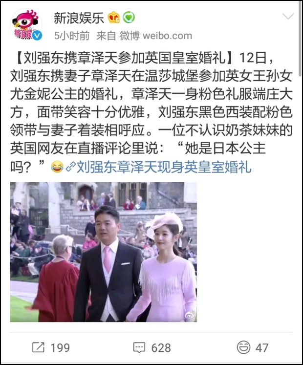 許多網友感嘆劉強東涉嫌“性侵”事件尚未水落石出,就和奶茶妹妹大秀恩愛,還能去參加皇室婚禮,令人服氣。