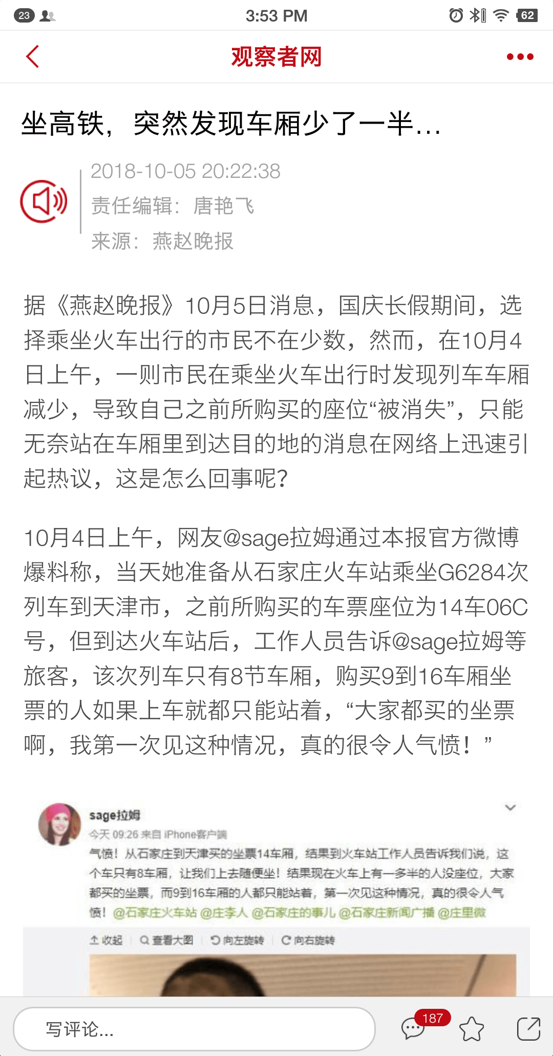 之前觀網發一篇報道,是關於高鐵少一半的那條新聞。