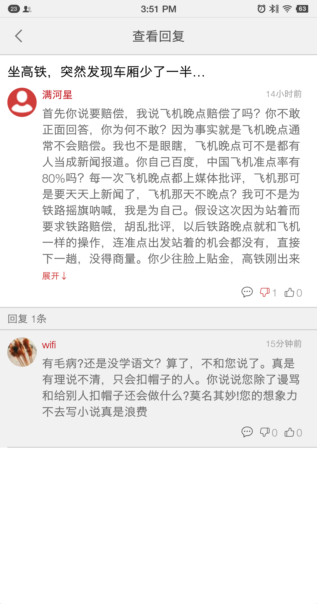 然後評論區就開始了持久的撕逼大戰,焦點就在於乘客和吃瓜羣眾該不該批評這件事情。因為本人是高鐵一族,遠途出行只坐高鐵,就今年坐高鐵不少於十次所以一看見這個新聞就點進去了。