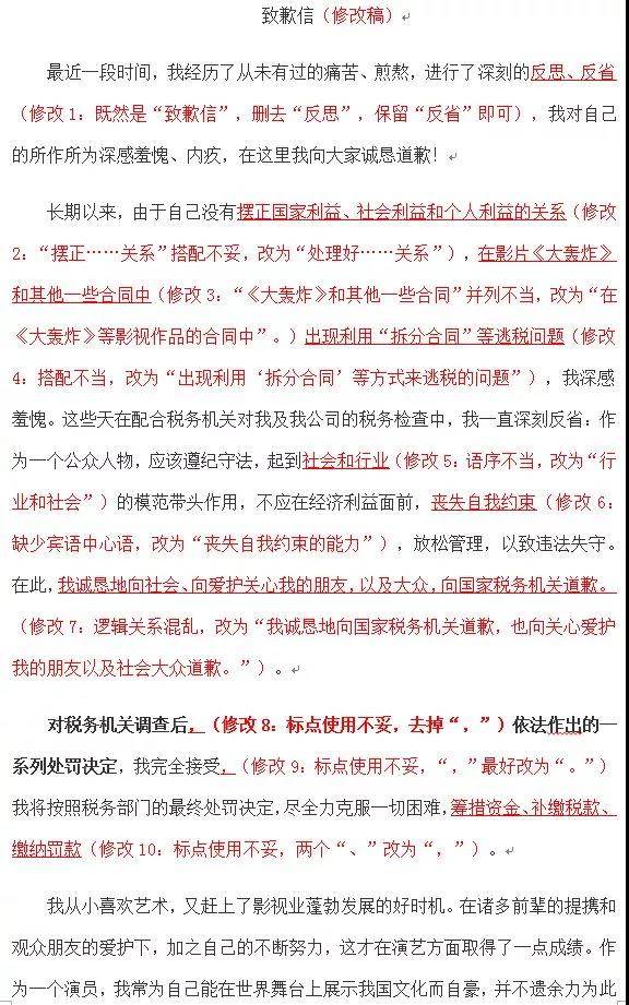長期以來,由於自己沒有擺正國家利益、社會利益和個人利益的關係,在影片《大轟炸》和其他一些合同中出現利用“拆分合同”等逃税問題,我深感羞愧。這些天在配合税務機關對我及我公司的税務檢查中,我一直深刻反省:作為一個公眾人物,應該遵紀守法,起到社會和行業的模範帶頭作用,不應在經濟利益面前,喪失自我約束,放鬆管理,以致違法失守。在此,我誠懇地向社會、向愛護關心我的朋友,以及大眾,向國家税務機關道歉。