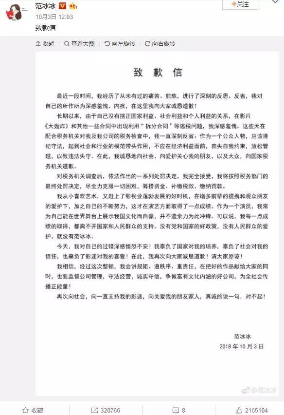 處於輿論法律漩渦中心的范冰冰當天即發佈道歉信: