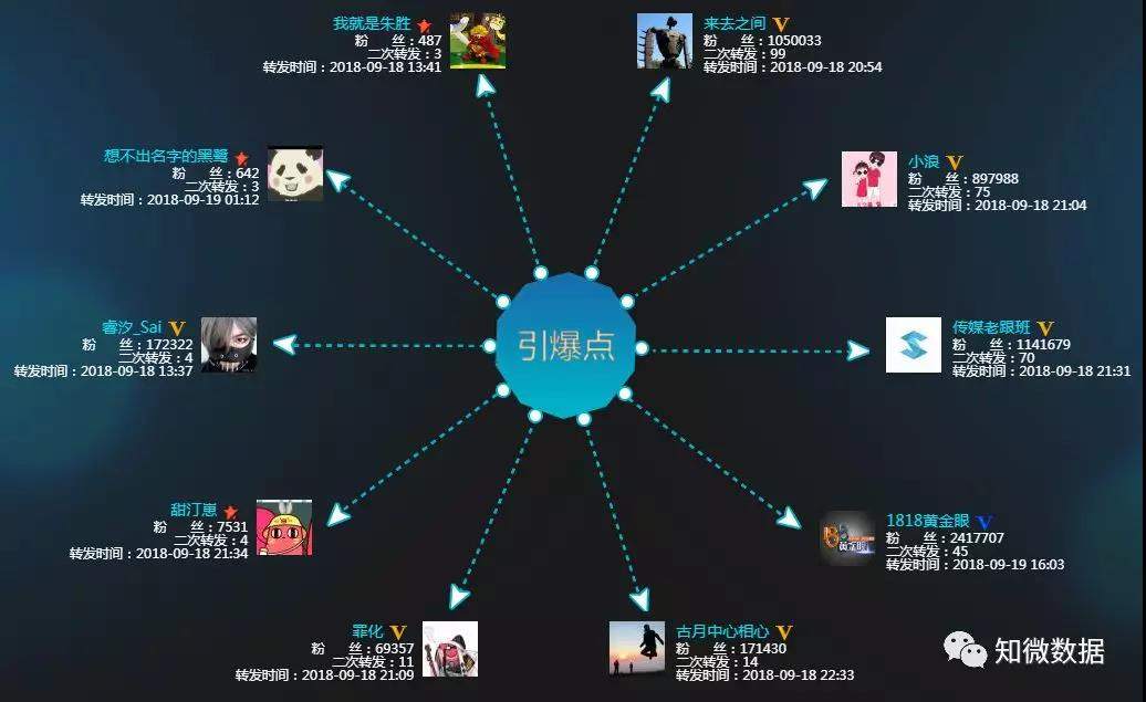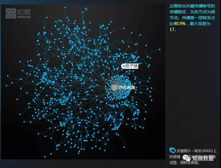 知微傳播分析發現,該微博傳播最大深度達17層,引爆點多為段子手,如@段子樓 @太皇太后您有喜啦 @噗尺 @最近腦洞有點大 @萬事屋紙紙醬 等。