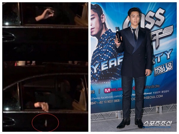 同樣是YG旗下男團BigBang的藝人T.O.P,也曾因為在中國出席活動期間被拍到乘車時隨意向窗外扔煙頭而受到指責。據當時網友拍攝的一段視頻顯示,T.O.P坐在一輛黑色轎車中,當時有大批粉絲圍在車外跟拍,而他卻將手上的煙頭,隨手丟到了車窗外。2017年,該成員還因為涉嫌吸毒被韓國警方立案調查。
