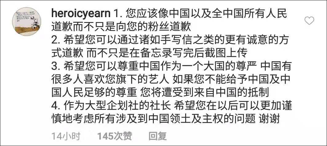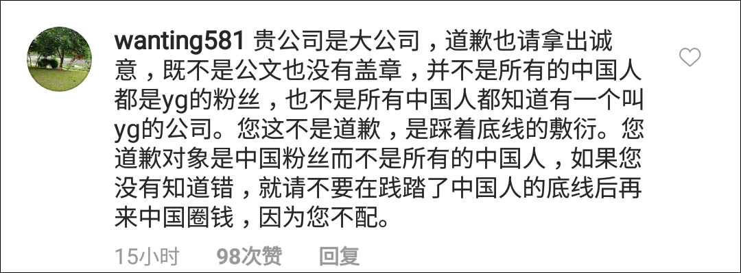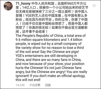 這名網友表示,中國960萬平方公里的國土,14億人口,就被你一個小公司拍出來的綜藝節目無緣無故的抹掉三分之一的面積,還説中國人是豬。YG的藝人還在中國發展,在中國有那麼多粉絲,現在就因為你們的立場,傷害了中國人。不做出官方道歉新聞,這件事不會結束。