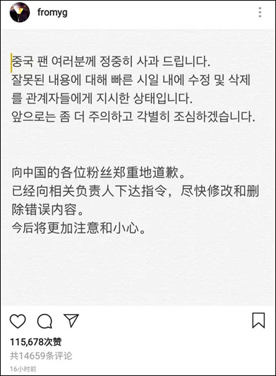 昨天晚上,YG娛樂社長梁鉉錫(楊賢碩)通過個人社交平台就節目涉及辱華內容公開發表道歉信。在道歉信中梁鉉錫表示“向中國的各位粉絲鄭重地道歉”,他還稱“已經向相關負責人下達指令,儘快修改和刪除錯誤內容”。值得注意的是,這份道歉信的內容使用了中韓兩種語言。