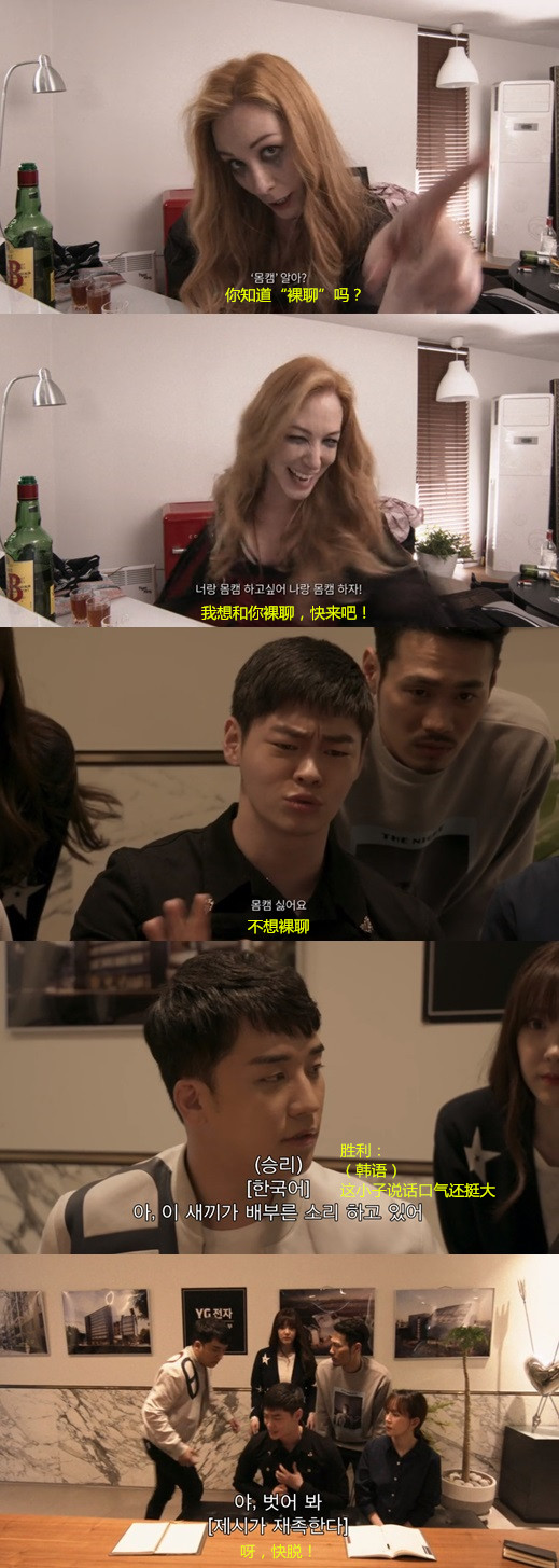 在節目中,醉酒的外國投資人指名要和YG的一名新人男模特“裸聊”,結果遭到拒絕。隨後,勝利扮演的男主不滿地説,“這小子口氣好大”“真是尊貴”。令觀眾感到不滿的是,節目中還出現男模準備逃離,結果被工作人員強脱衣服的畫面。