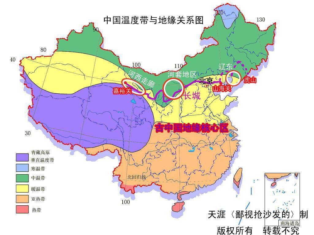 能否獲得上述三個地區是古典時期的中國是否強大的重要標誌。而這三個地區也恰恰處在適合耕種的“暖温帶”與難以耕種的“中温帶”交界處,長城也大致修於此。