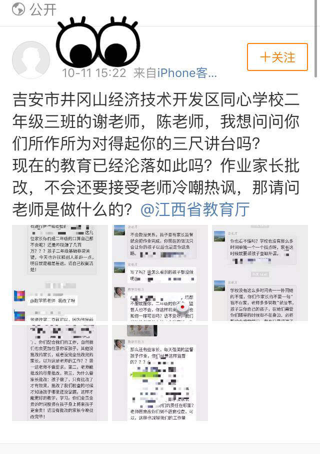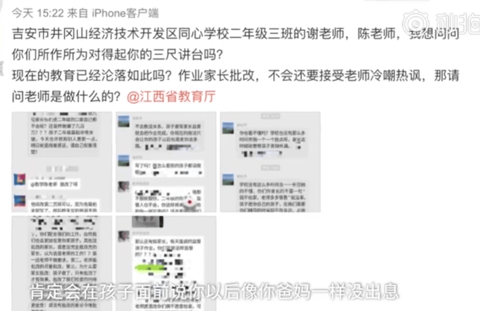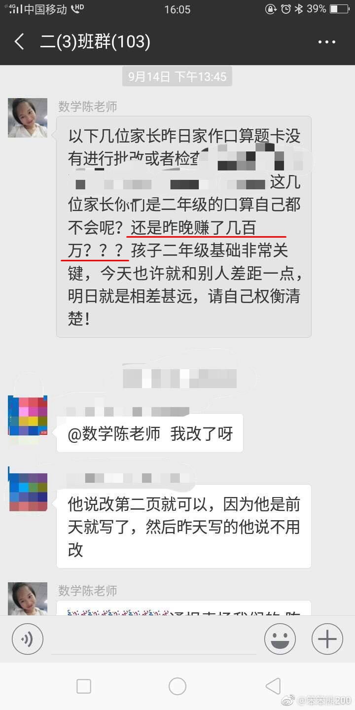 10月11日,網曝江西吉安井岡山經開區學校幾名家長,因未批改作業被老師在家長羣裏點名批評:“昨晚賺了幾百萬?”“你這樣將來你的孩子和你一樣可悲!”