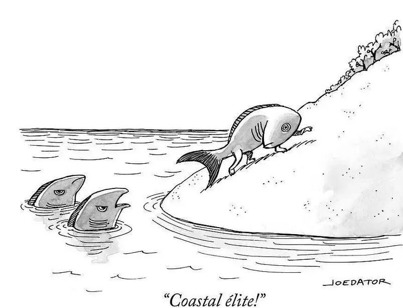 圖為紐約客雜誌刊登的關於沿海精英的漫畫,By Joe Dator
