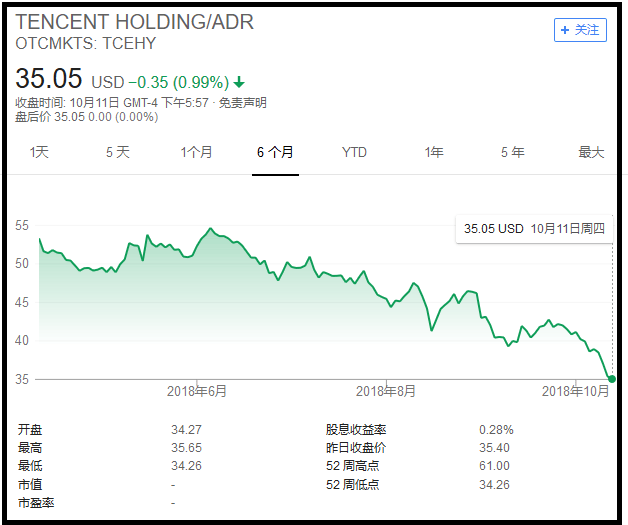 今年2月份,騰訊的股價還一度破了歷史,達到了475.72港元的高價。然而,今非昔比。11日早上,騰訊的開盤價為274港元,較前一交易日收盤價跌了4.44%。而11日下午16點收盤時,騰訊股價再度下跌6.77%,報價267港元,市值2.54萬億港元。這樣的數字,創下了騰訊15個月來新低,連續10下跌的記錄也是騰訊上市以來最長的連跌記錄。超過40%的下跌幅度,1.7萬個“小目標”就此蒸發,騰訊再也不是全球前十大公司了。