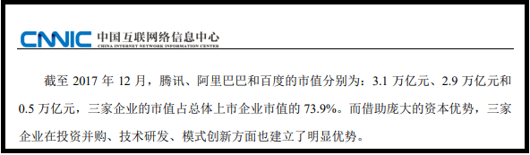 然而,就像是美國的五大科技公司那樣,不管怎麼跌,巨頭永遠都是巨頭,要知道這三家背後代表了中國互聯網73.9%的市值。搜索用百度,聊天用微信,購物用淘寶。沒錯,他們是各自有競品,但有哪家做到了和他們差不多的市場額。