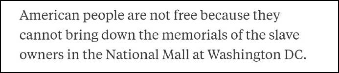 中國人還沒有自由。當中國足夠強大並且可以像西方國家那樣在世界上做任何他們想做的事情時,他們將是自由的。可能有一天,當中國人可以定義什麼是自由時,然後他們會説美國人民不自由,因為美國人民不能拆除在華盛頓特區國家廣場上豎立起的奴隸主紀念碑。